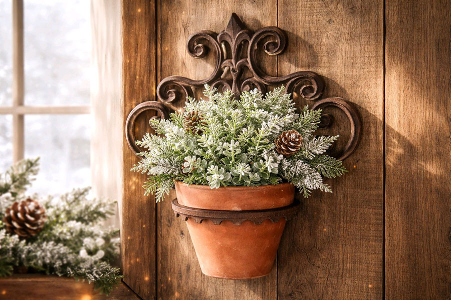 Aufwendig verziertes Wandornament mit Ring für einen Blumentopf aus nostalgisch wirkendem Gusseisen