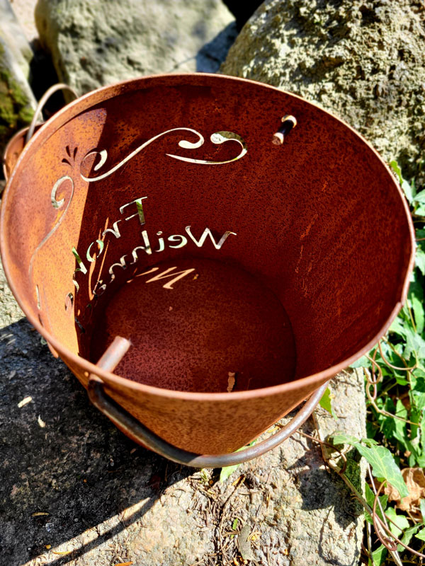 - Windlicht aus Metall mit kräftiger Edelrostpatina