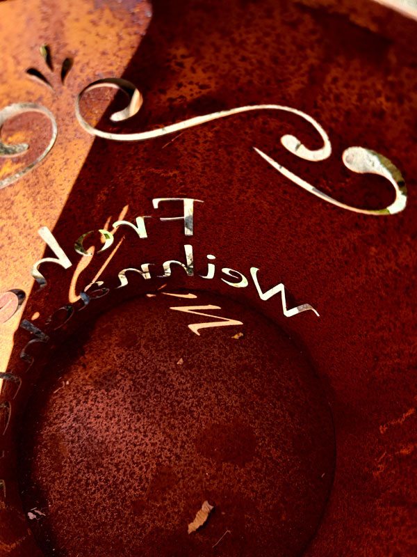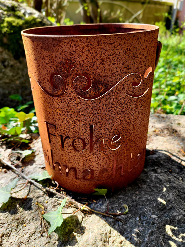 Windlicht oder kleine Feuertonne "Frohe Weihnachten" mit Edelrostpatina