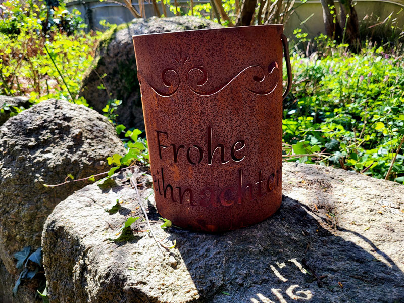 Windlicht oder kleine Feuertonne "Frohe Weihnachten" mit Edelrostpatina
