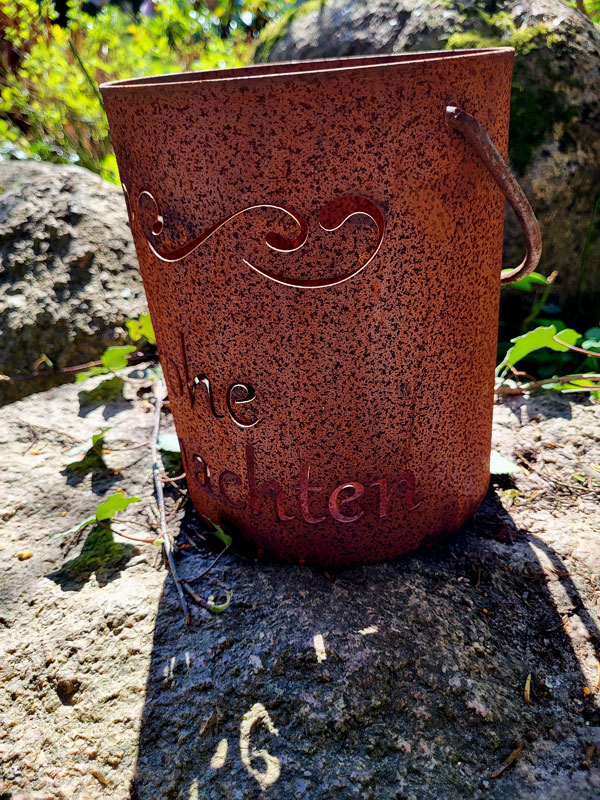 - Windlicht aus Metall mit kräftiger Edelrostpatina