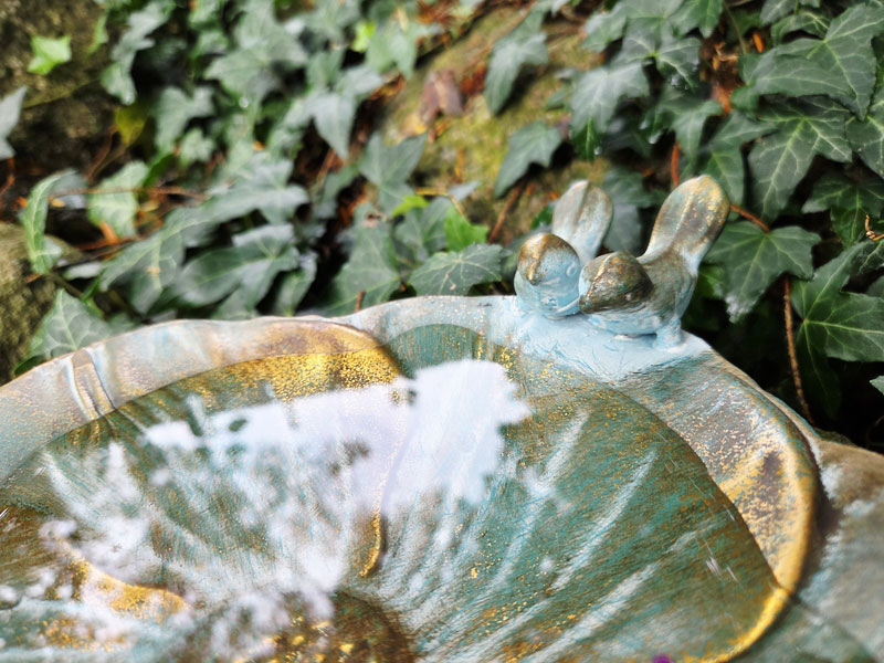 Flache Wassertränke mit 2 Vögelchen und antikwirkender Lackierung