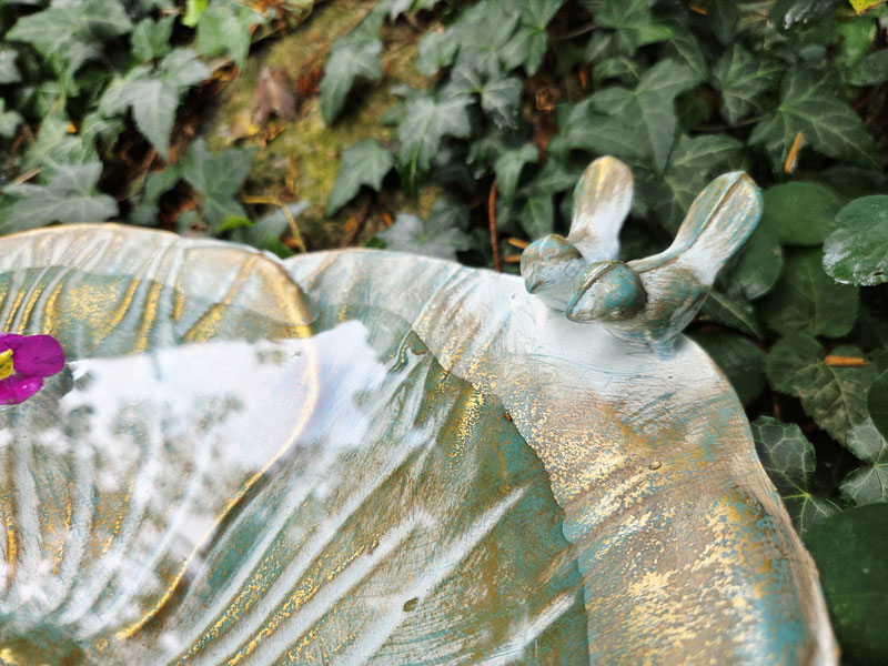 Flache Wassertränke mit 2 Vögelchen und antikwirkender Lackierung