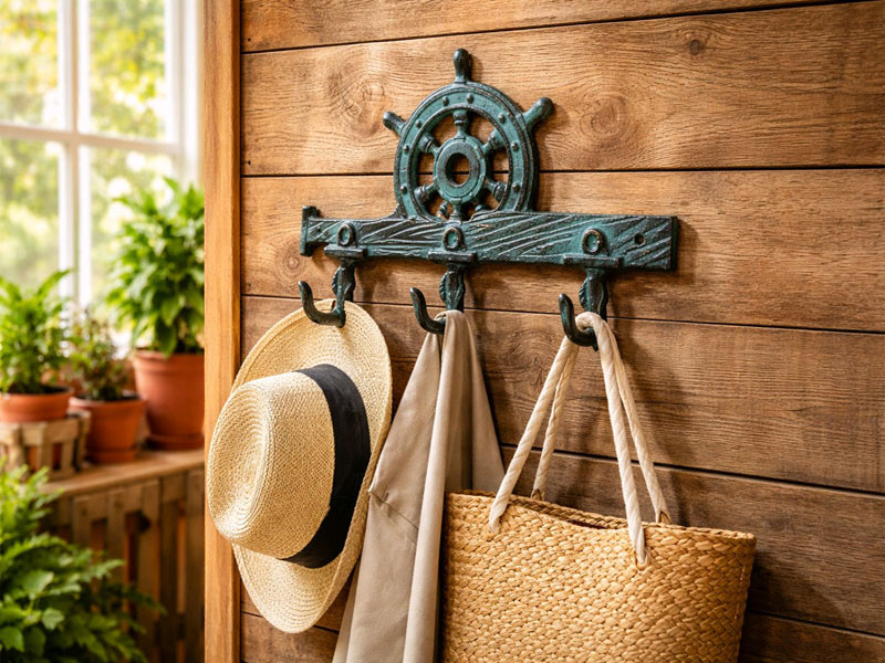 Maritimer 6er Wandhaken "Steuerrad" mit antik wirkender blauer Lackierung