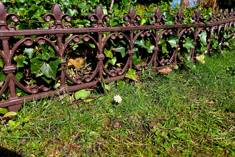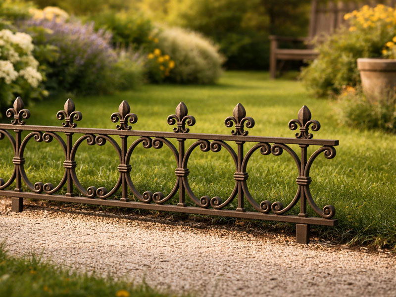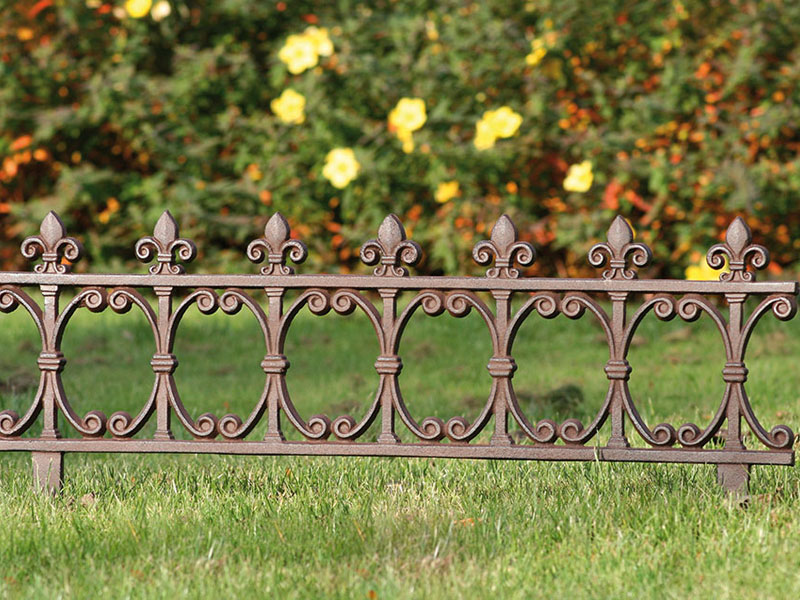 Wunderschön verzierte, breite Beeteinfassung aus antik gehaltenem Gusseisen