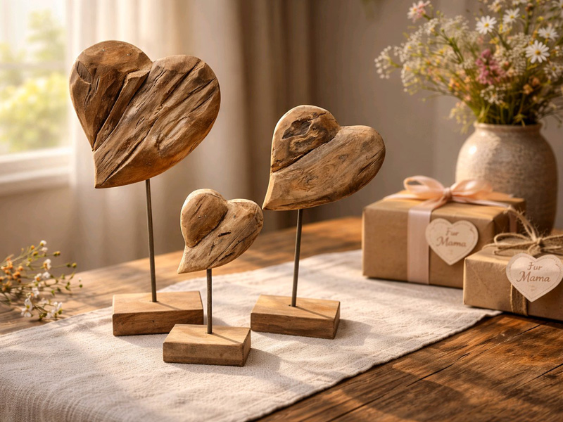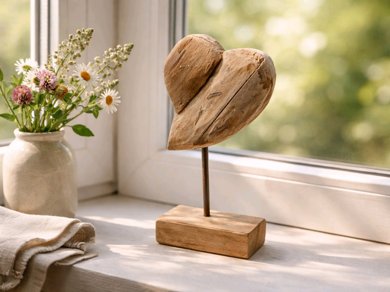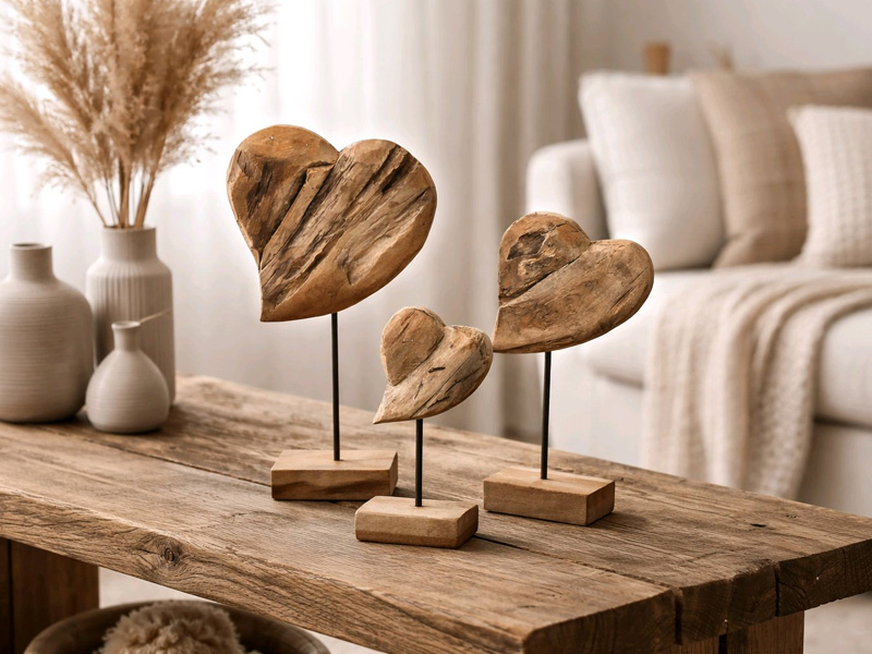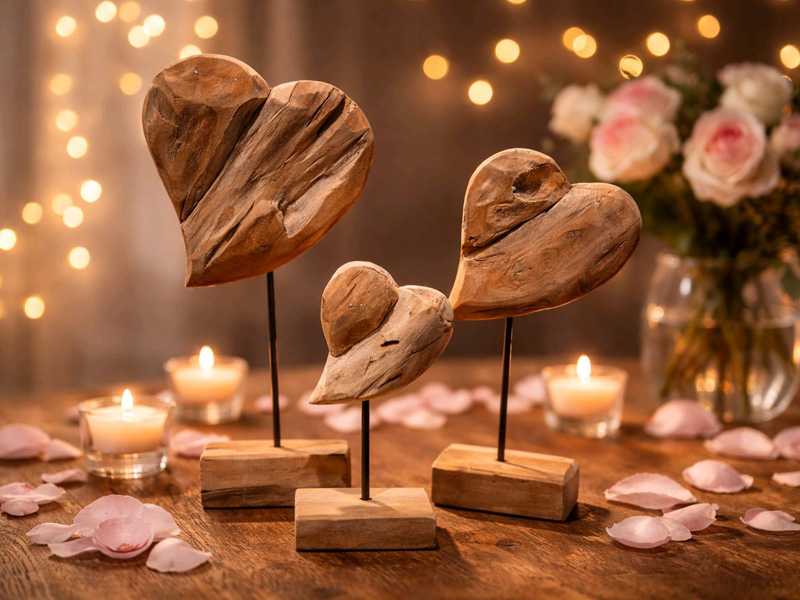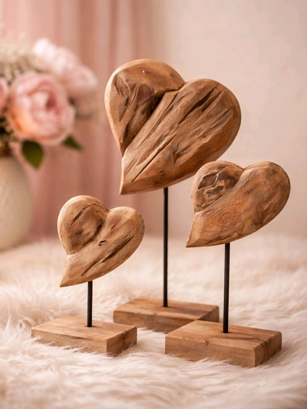 Handgefertigtes Teakholz Deko Herz 25cm auf Standfuß