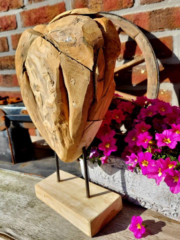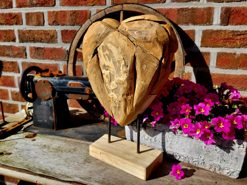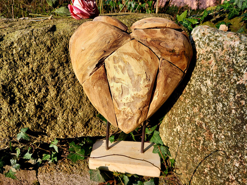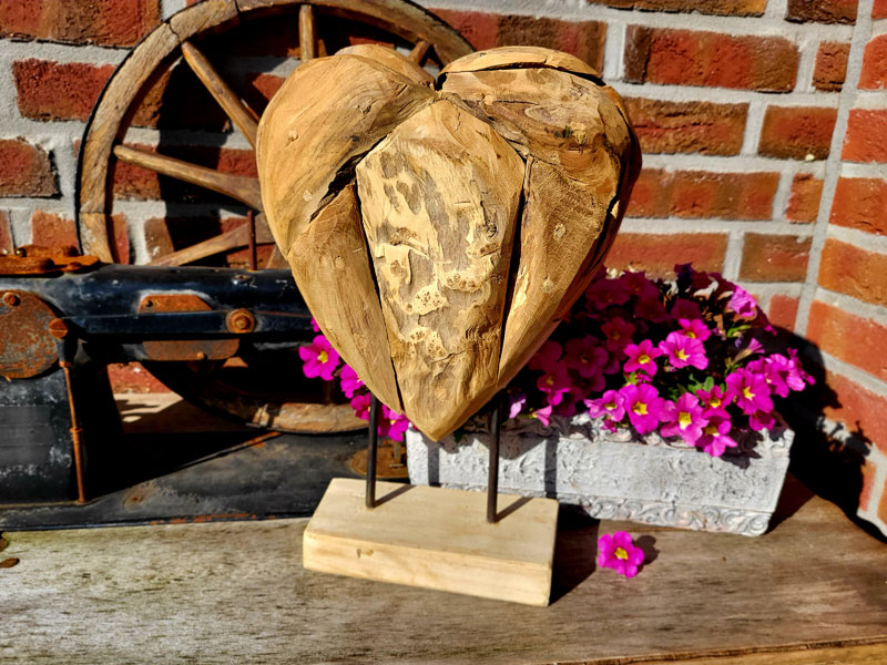 Handgefertigtes, massives Teakholz Deko Herz 40cm auf Standfuß