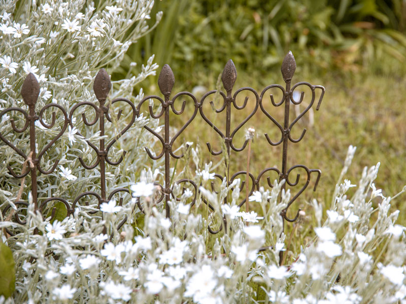 Romantisch verzierte Beeteinfassung aus antik gehaltenem Schmiedeeisen