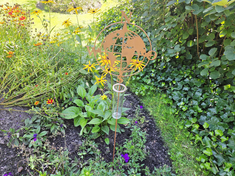 Einfach den Stecker in den Boden drücken, der Regen sammelt sich im Messzylinder – so weißt du jederzeit, wie viel Wasser deine Pflanzen bereits bekommen haben und kannst gezielter gießen. Die dekorative Kompassrose mit integrierter Weltkarte rundet das maritime Design ab.