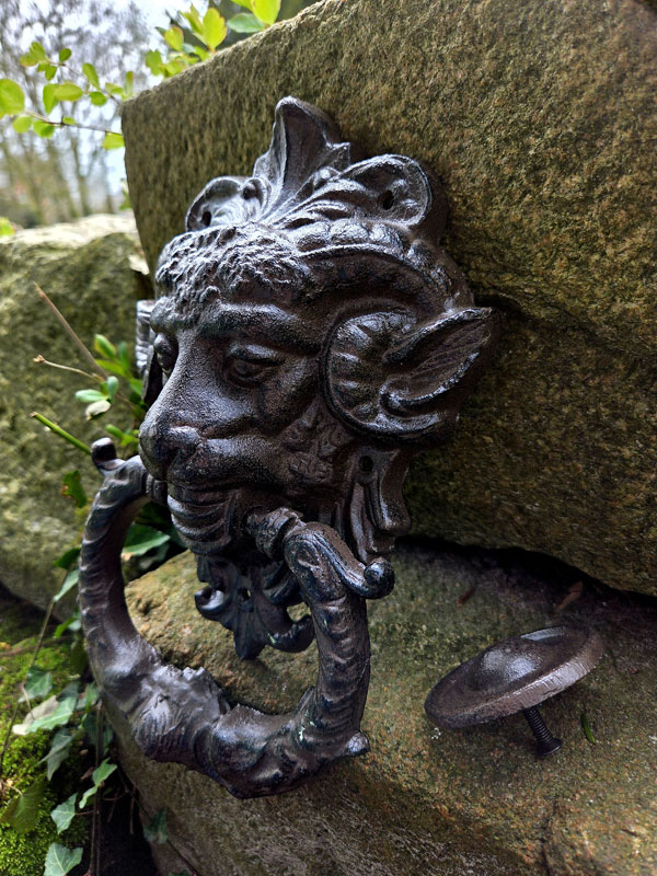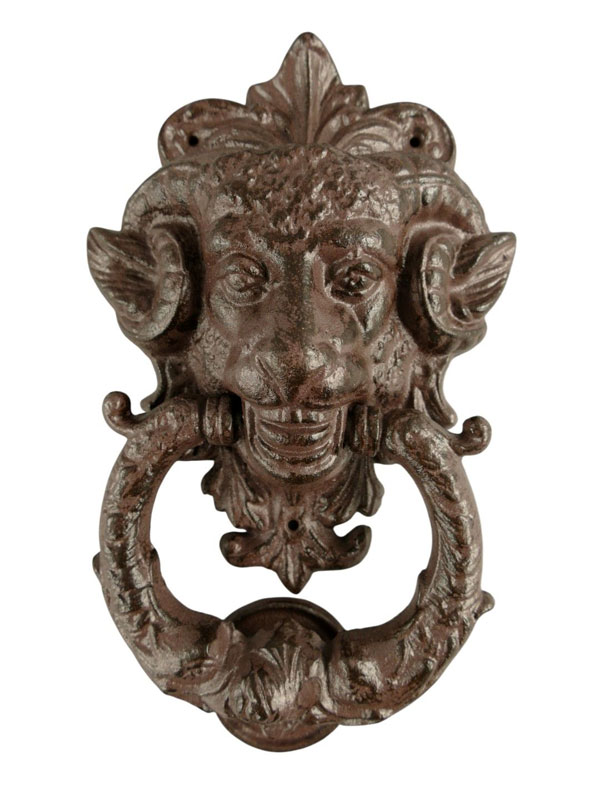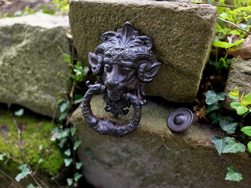 Die detailreiche Gestaltung mit kunstvoll ausgearbeiteten Hörnern und dem dekorativen Klopfring macht dieses Stück zu einem echten Blickfang. Die dunkle Oberfläche unterstreicht den antiken Charakter und sorgt für eine authentische, zeitlose Optik.