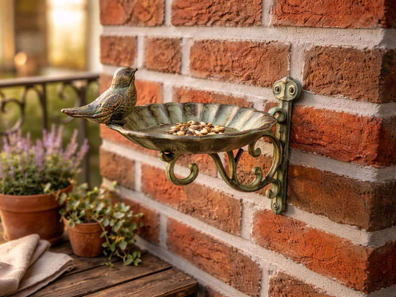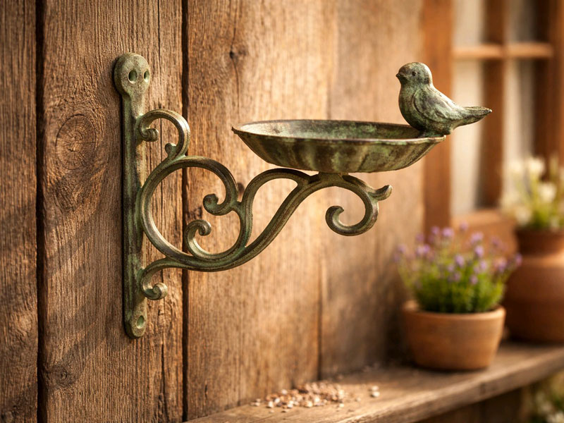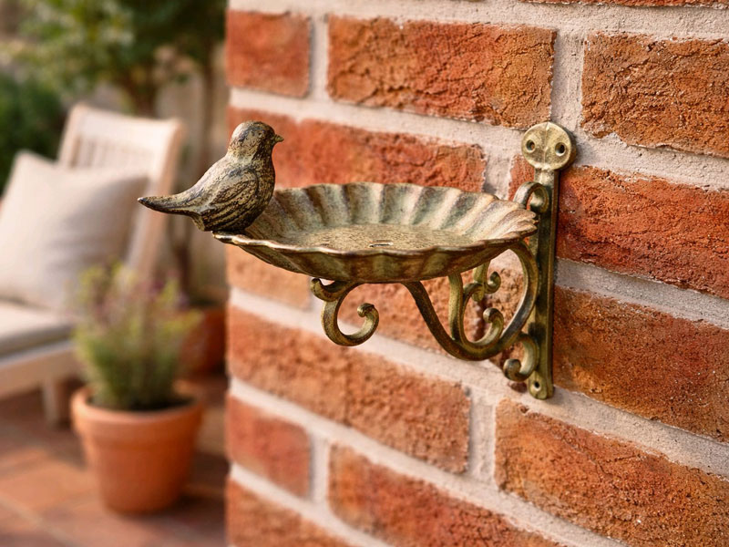 Aufwendig verzierte Wandhalterung mit Vogeltränke aus Gusseisen mit Antiklackierung