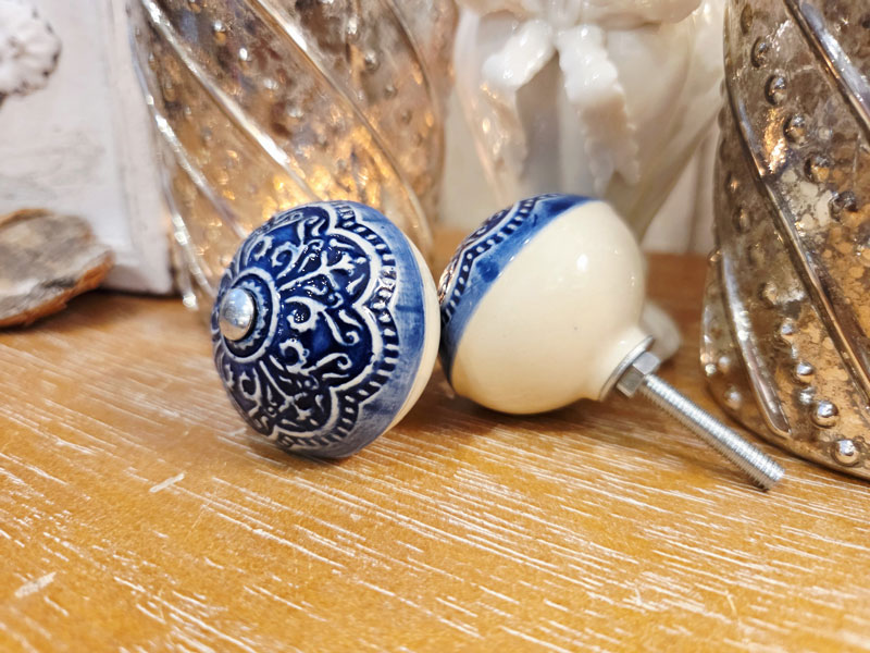 Nostalgischer Keramik Möbelknopf "Ornamentalisch blau-creme"