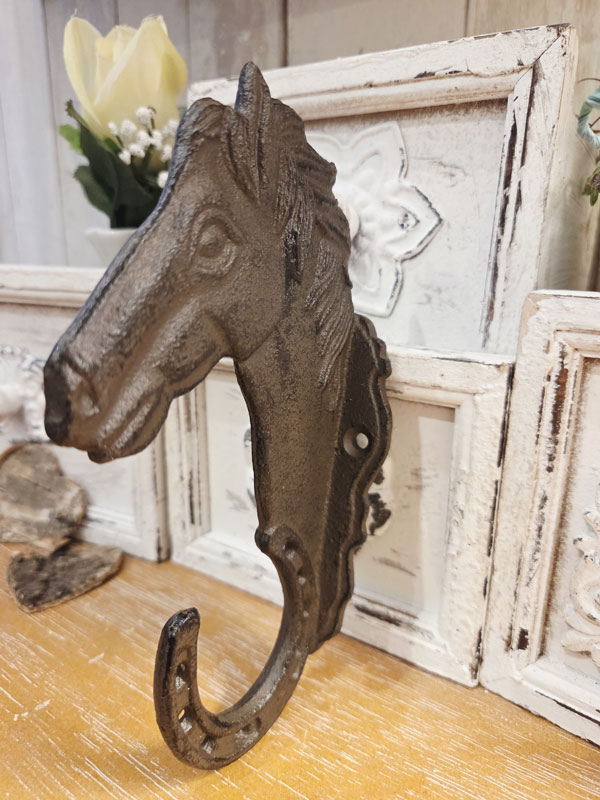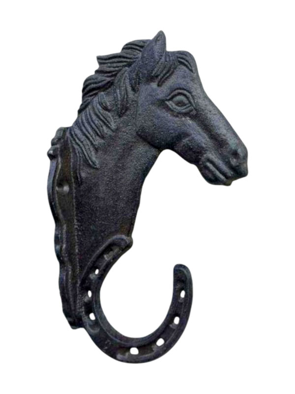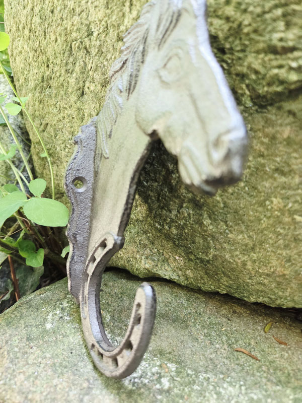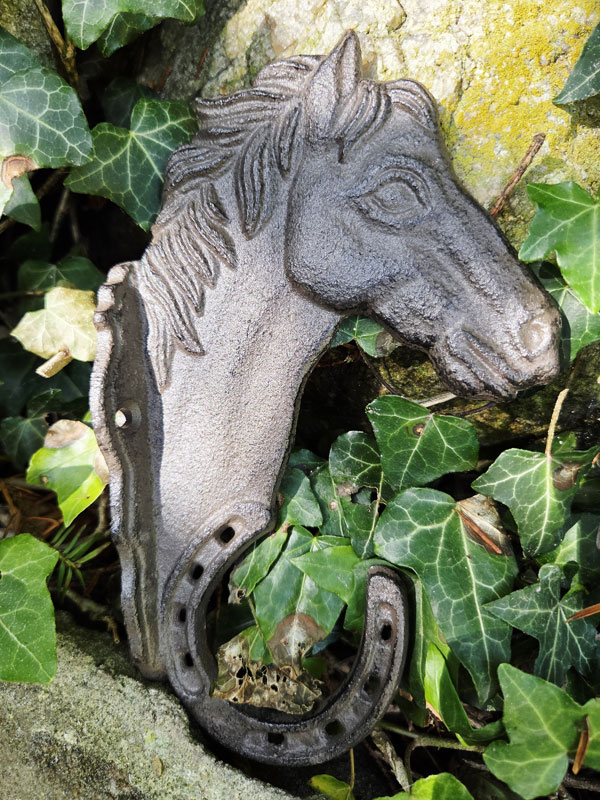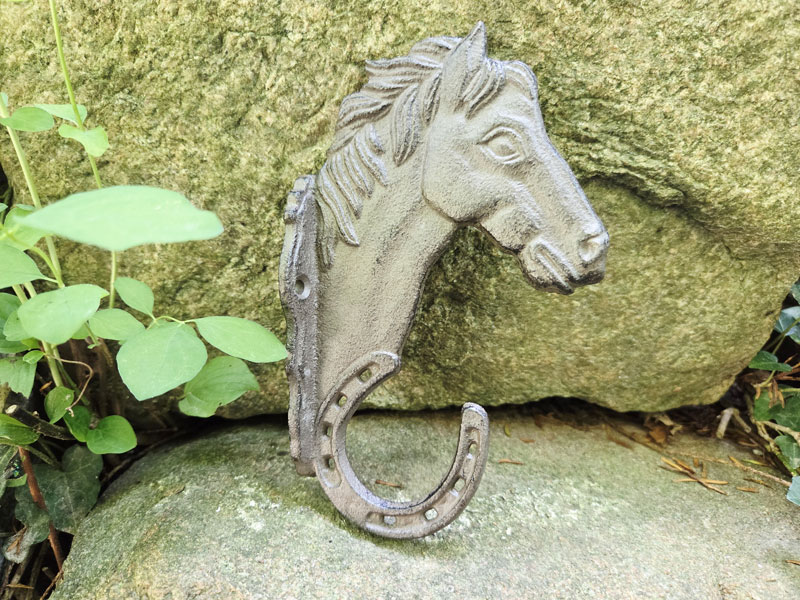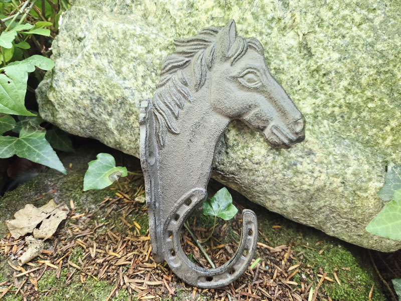 - Wandhaken mit Pferdemotiv und Haken in Hufeisenform aus massivem Gusseisen