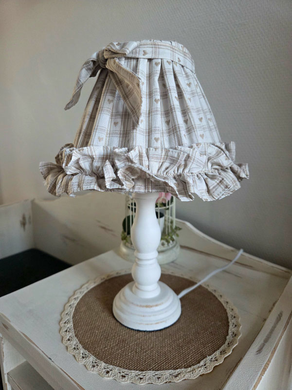 - Mit braun-weißem, textilem Lampenschirm "Herzchen" mit Rüschen und Schleifchen