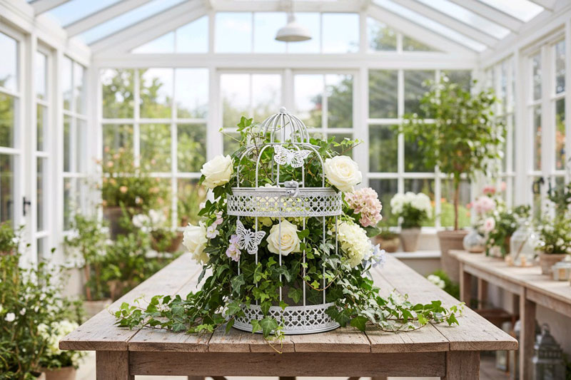 Dekorativer Vogelkäfig aus weiß lackiertem Metall