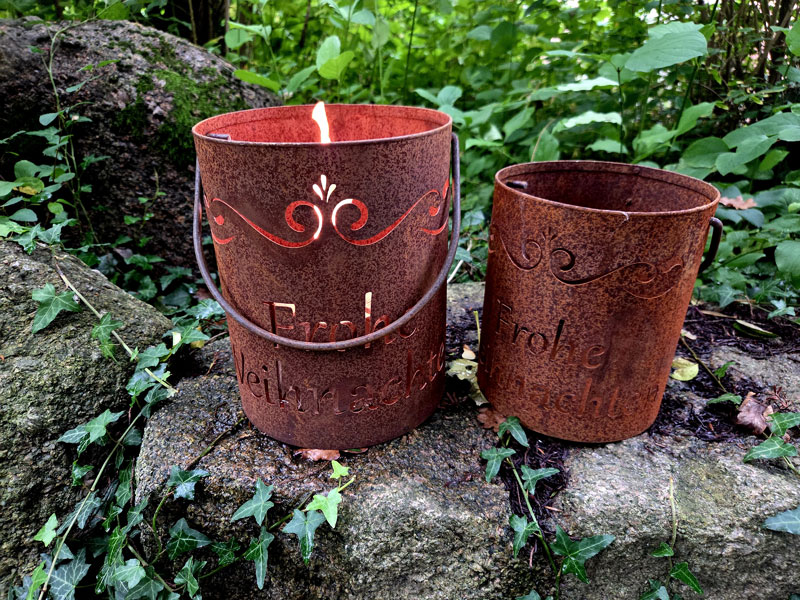 Windlicht oder kleine Feuertonne "Frohe Weihnachten" mit Edelrostpatina