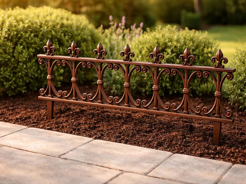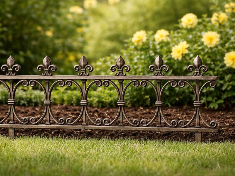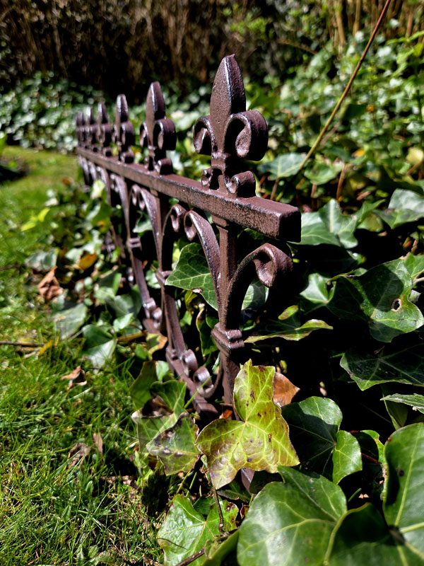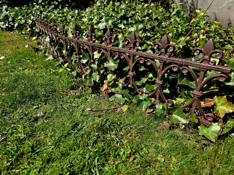 Wunderschön verzierte, breite Beeteinfassung aus antik gehaltenem Gusseisen
