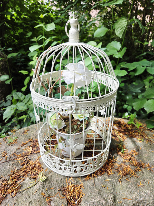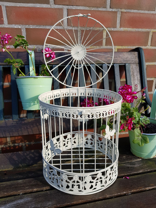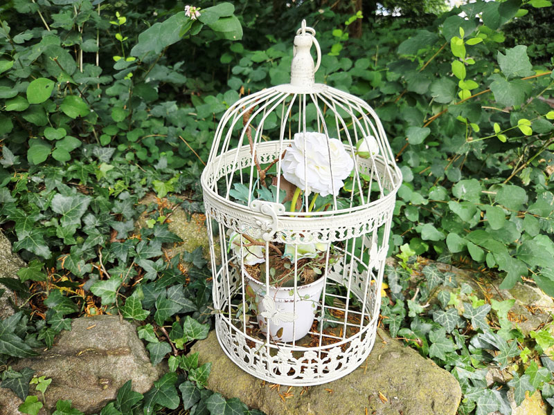 - Vogelkäfig aus Metall weiß mit dunklen Nuancen im Shabby Chic patiniert