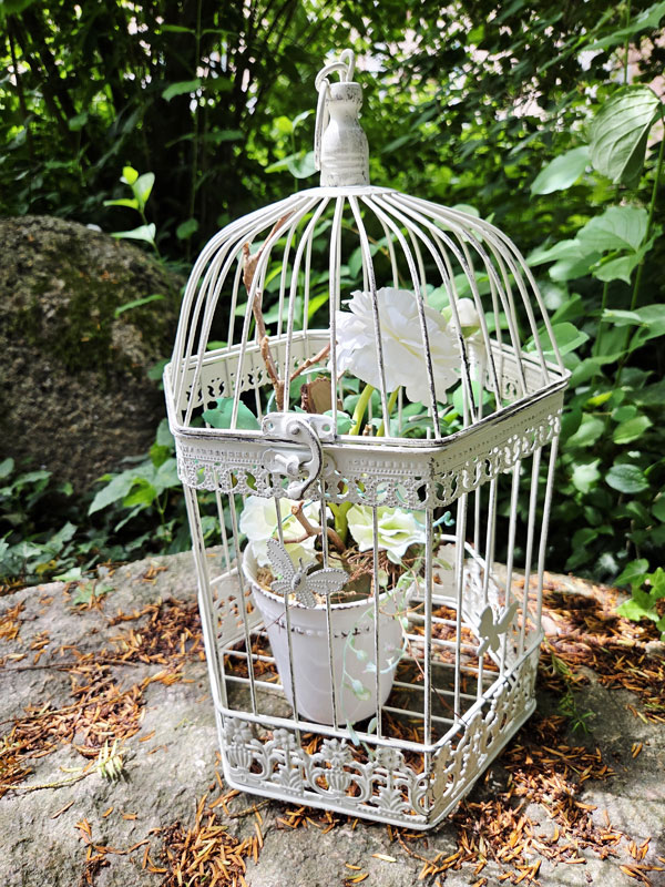 - Vogelkäfig aus Metall weiß mit dunklen Nuancen im Shabby Chic patiniert