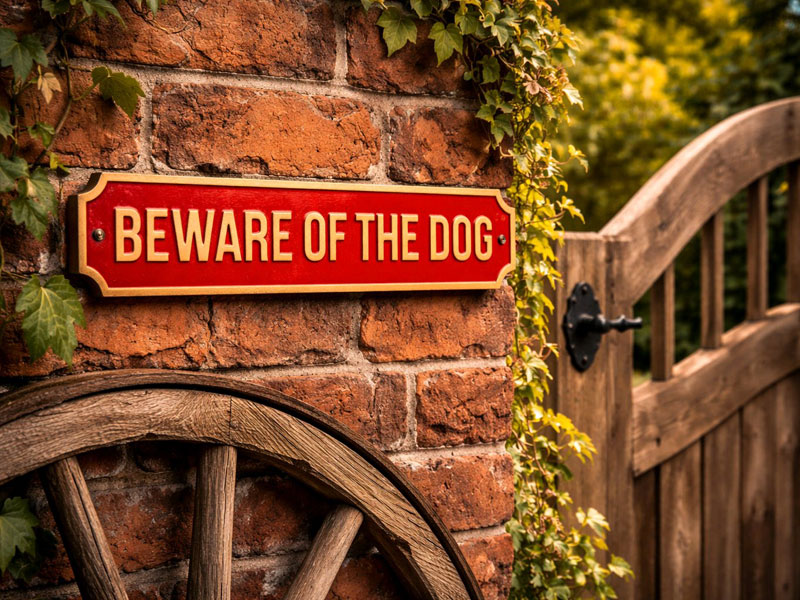 - Großes Schild "Beware of the Dog" (Vorsicht vor dem Hund) in der Signalfarbe Rot