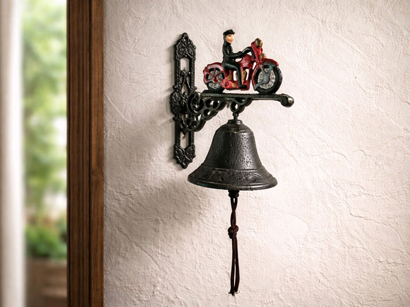 Kleine Wandglocke "Motorrad mit Biker" Gusseisen farbig lackiert