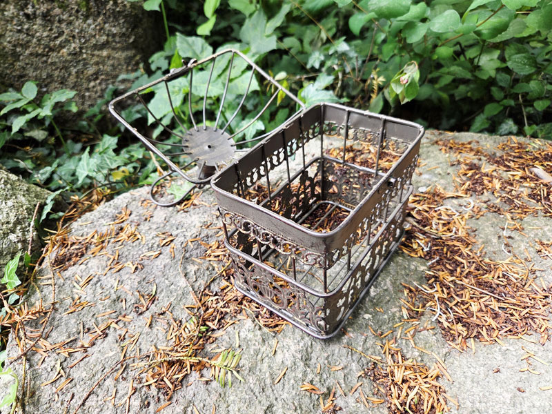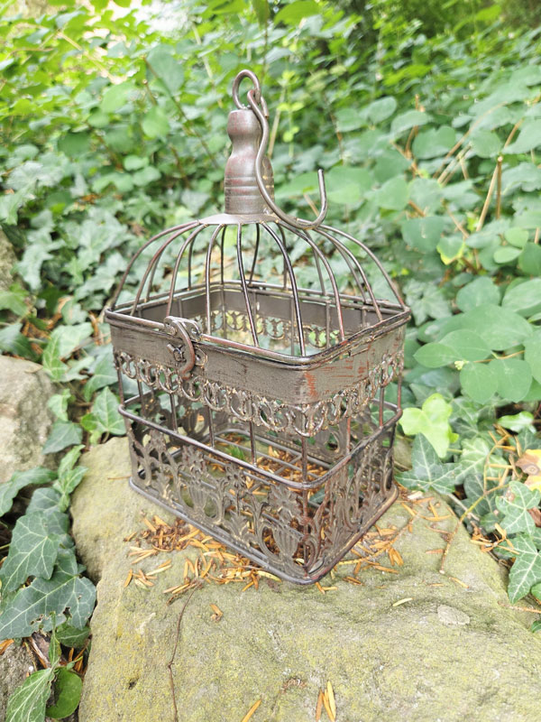 Kleiner Vogelkäfig in rechteckiger Form aus antik wirkendem patinierten Metall