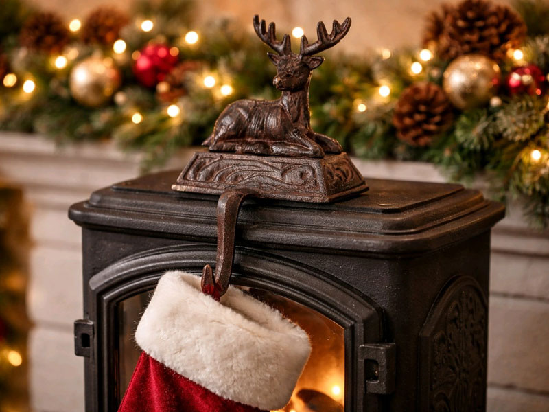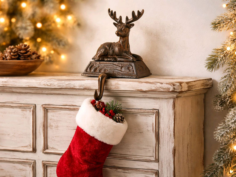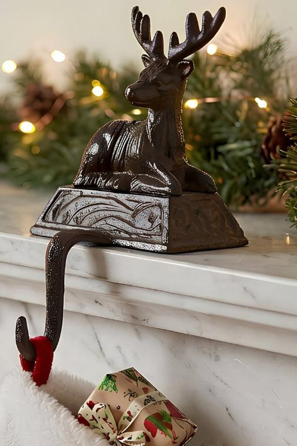 Mache deinen Kamin oder deine Fensterbank zum festlichen Highlight – mit diesem charmanten Nikolausstrumpfhalter aus Gusseisen mit Hirschfigur.