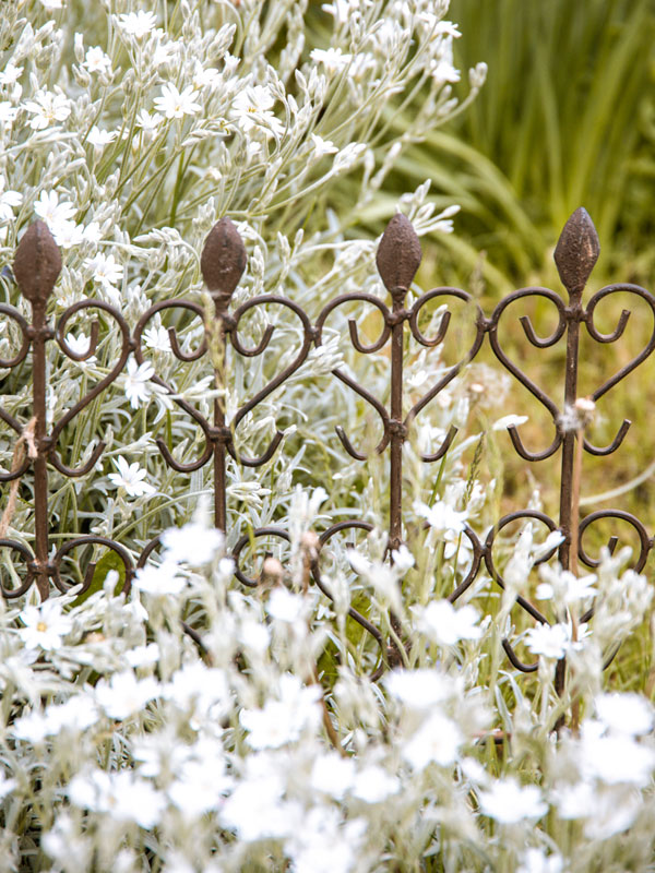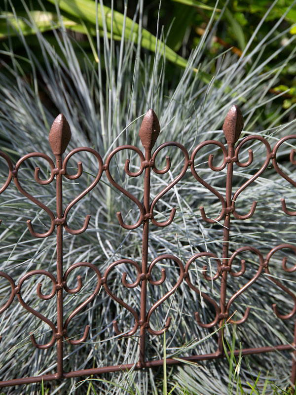 Romantisch verzierte Beeteinfassung aus antik gehaltenem Schmiedeeisen
