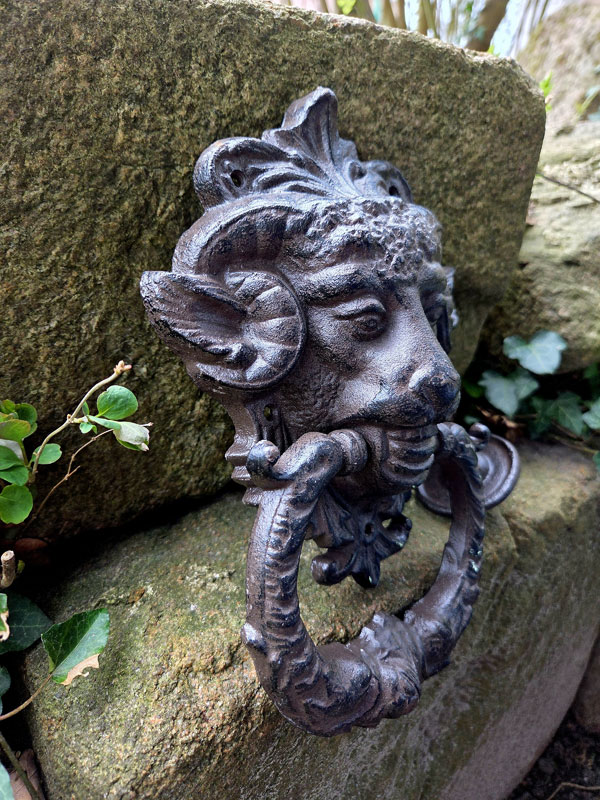 Die detailreiche Gestaltung mit kunstvoll ausgearbeiteten Hörnern und dem dekorativen Klopfring macht dieses Stück zu einem echten Blickfang. Die dunkle Oberfläche unterstreicht den antiken Charakter und sorgt für eine authentische, zeitlose Optik.