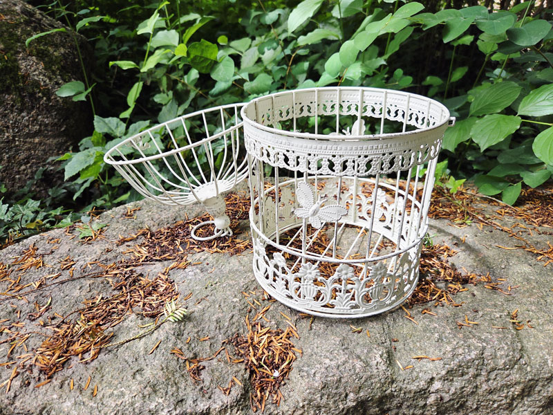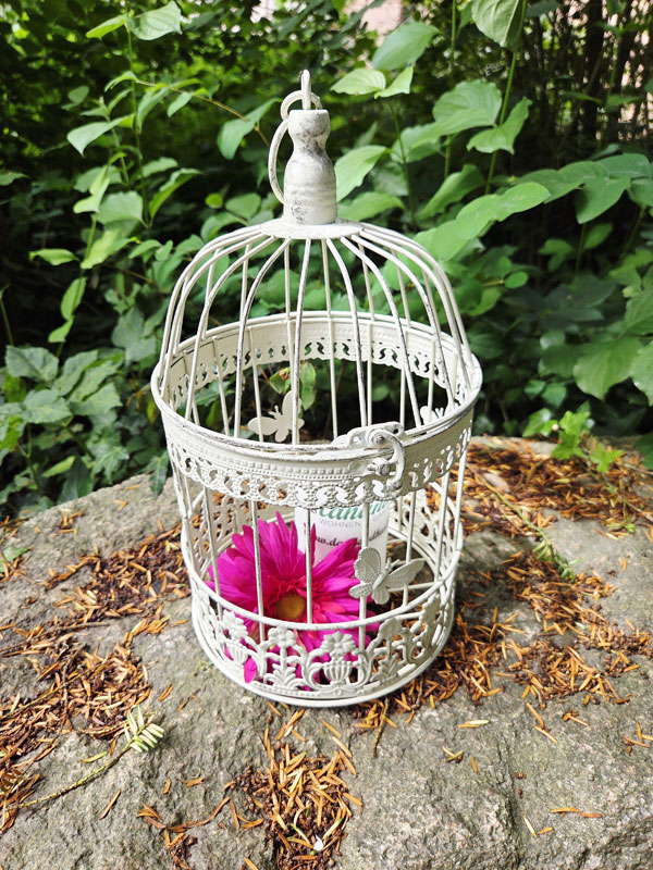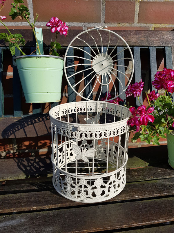 - Vogelkäfig aus Metall weiß mit dunklen Nuancen im Shabby Chic patiniert