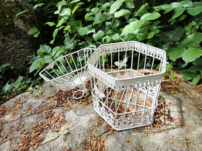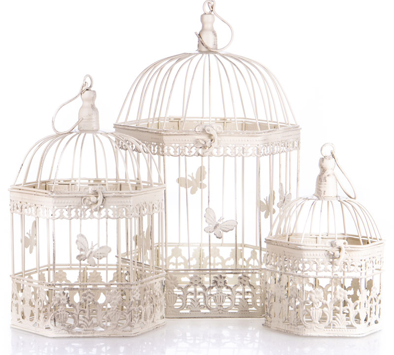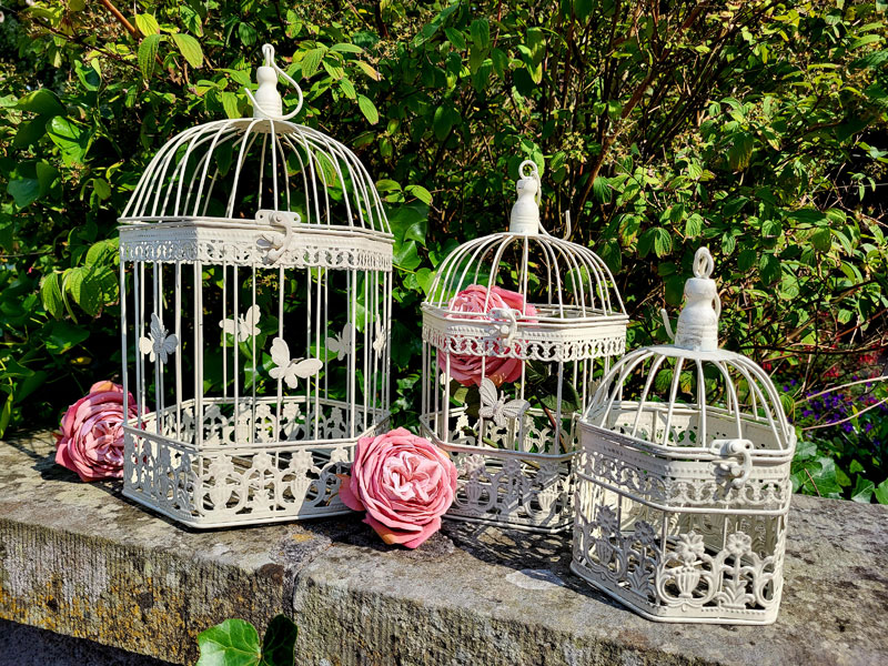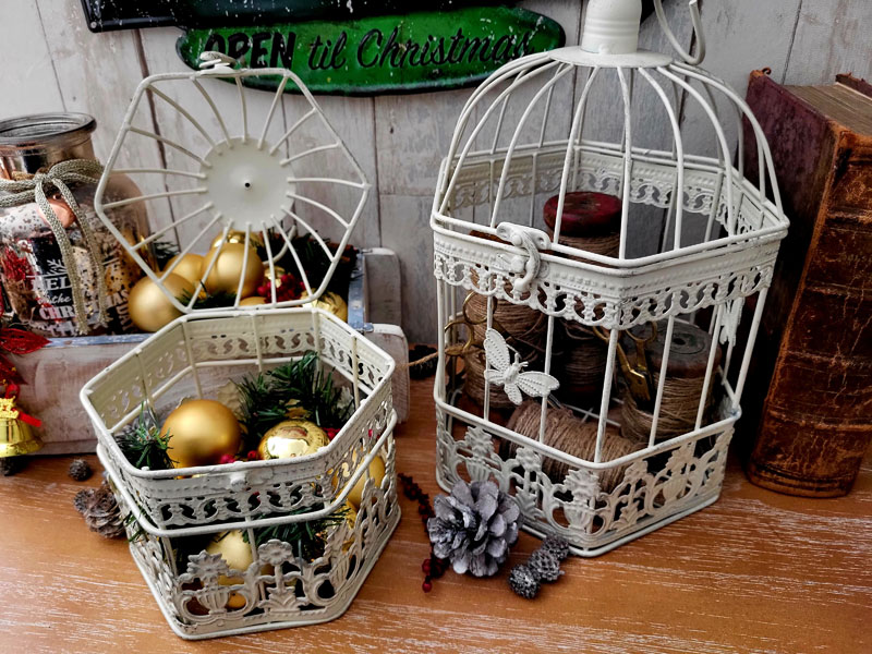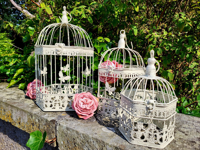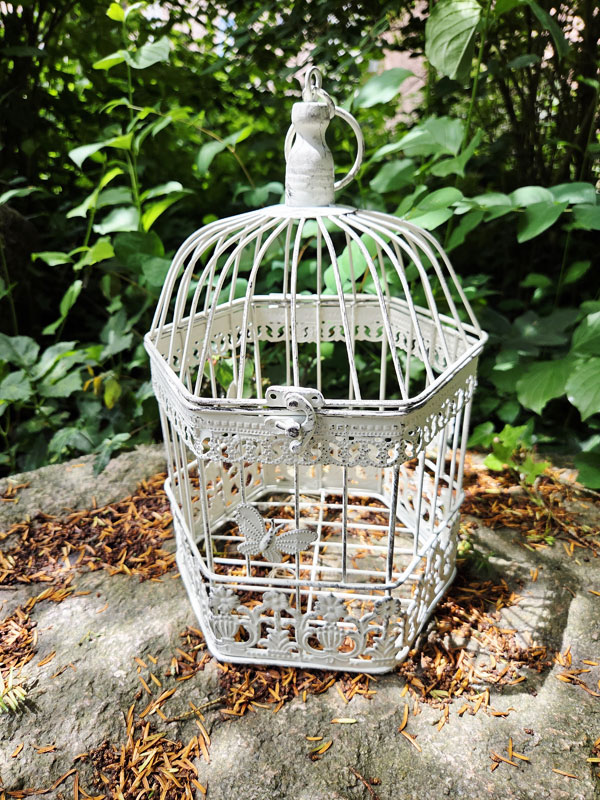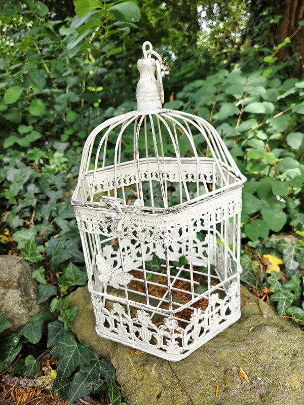 - Vogelkäfig aus Metall weiß mit dunklen Nuancen im Shabby Chic patiniert