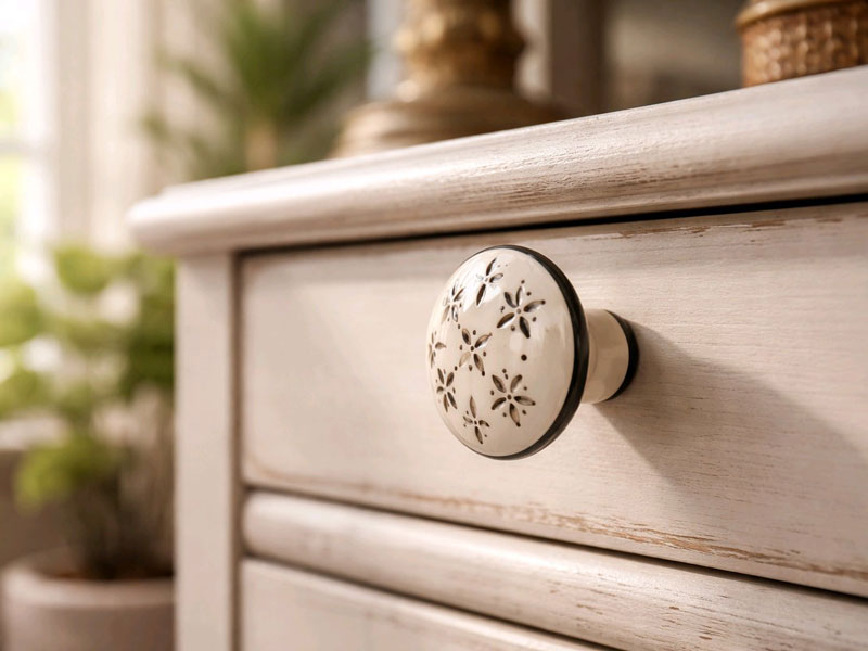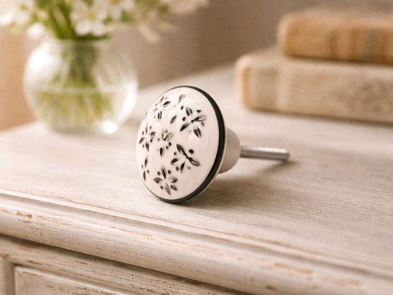 Nostalgischer Keramik Möbelknopf "Cremeweiß mit schwarzen Applikationen"