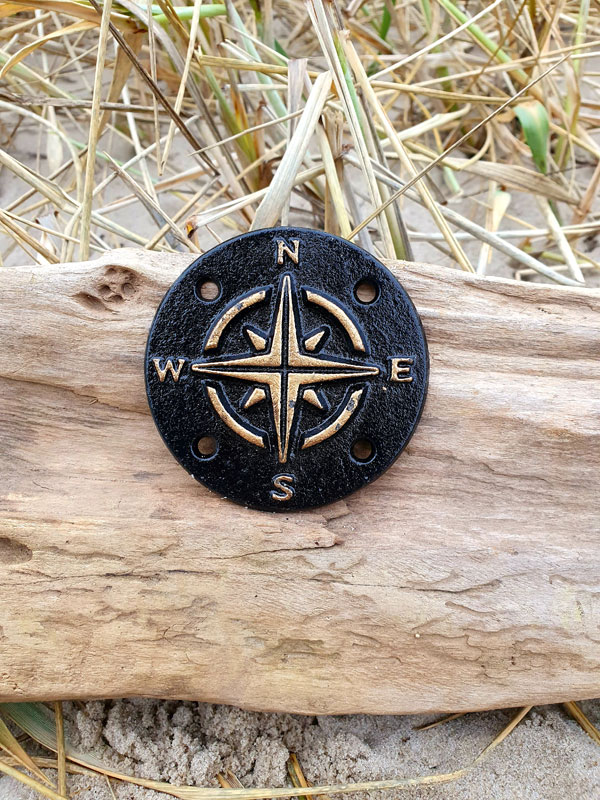 Schwarz lackiert, mit goldfarbener Windrose und Himmelsrichtungen