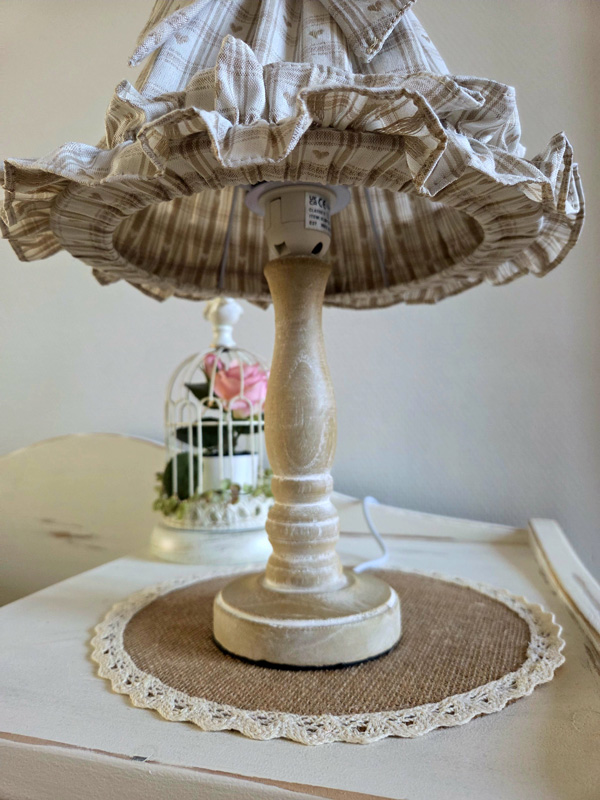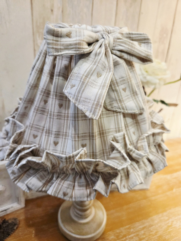 - Mit braun-weißem, textilem Lampenschirm "Herzchen" mit Rüschen und Schleifchen