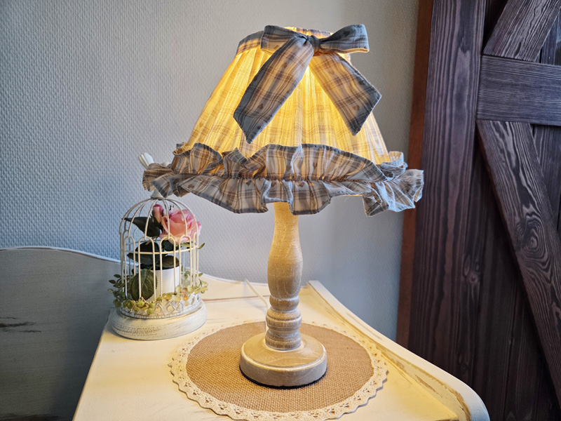 Der dekorative Lampenschirm mit feinen Rüschen und einem verspielten Schleifchen verleiht der Lampe einen zarten, femininen Touch. Sein Stoff sorgt für ein angenehm weiches, atmosphärisches Licht – ideal für Fensterbänke, Sideboards, Nachttische oder gemütliche Leseecken.