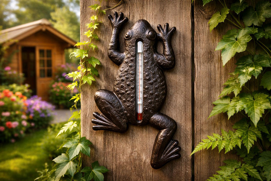 Das integrierte Thermometer ist gut ablesbar und zeigt die Temperatur zuverlässig an. Dank des wetterfesten Materials eignet sich der Frosch ideal für den ganzjährigen Einsatz im Außenbereich und entwickelt mit der Zeit eine schöne, natürliche Patina.