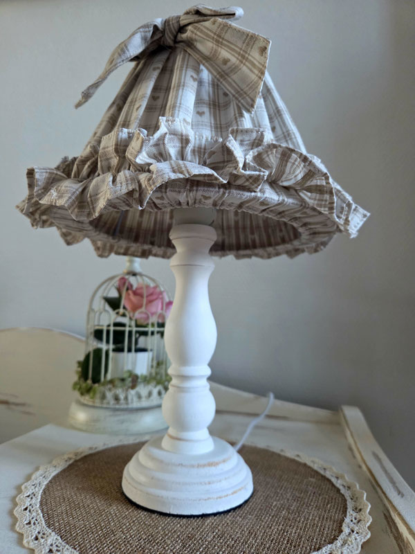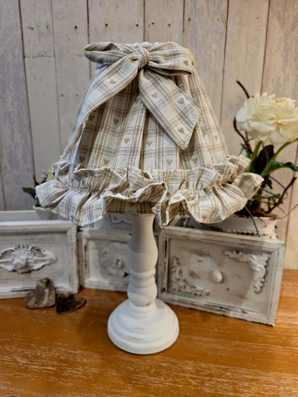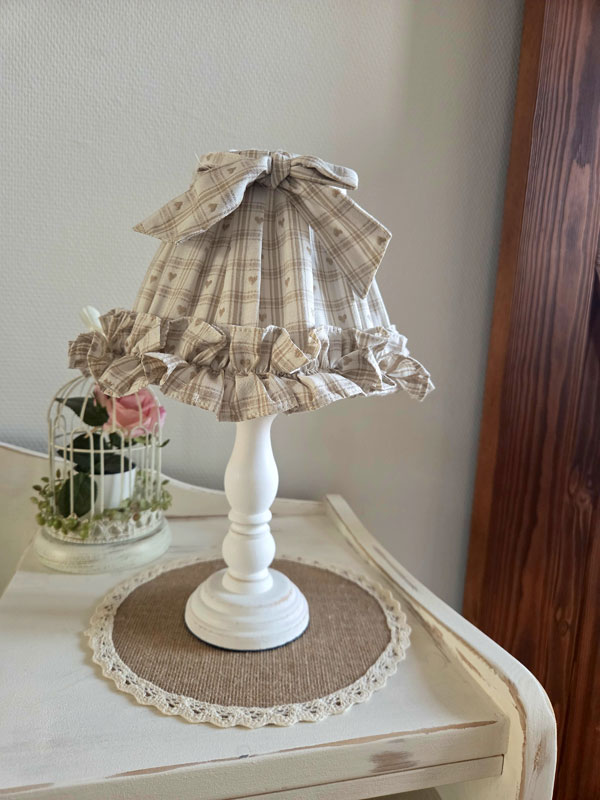- Mit braun-weißem, textilem Lampenschirm "Herzchen" mit Rüschen und Schleifchen